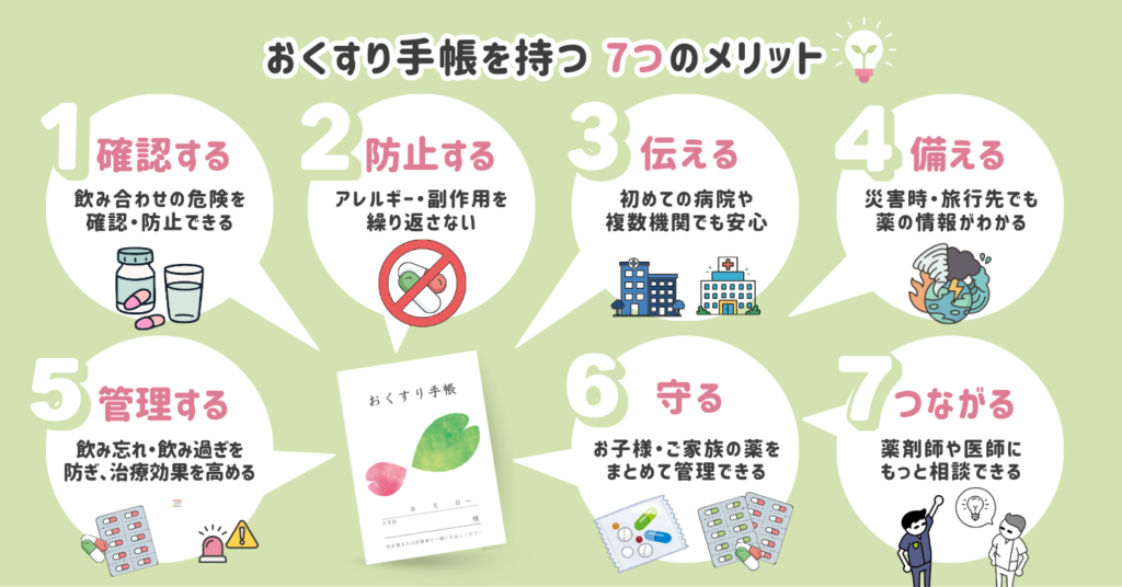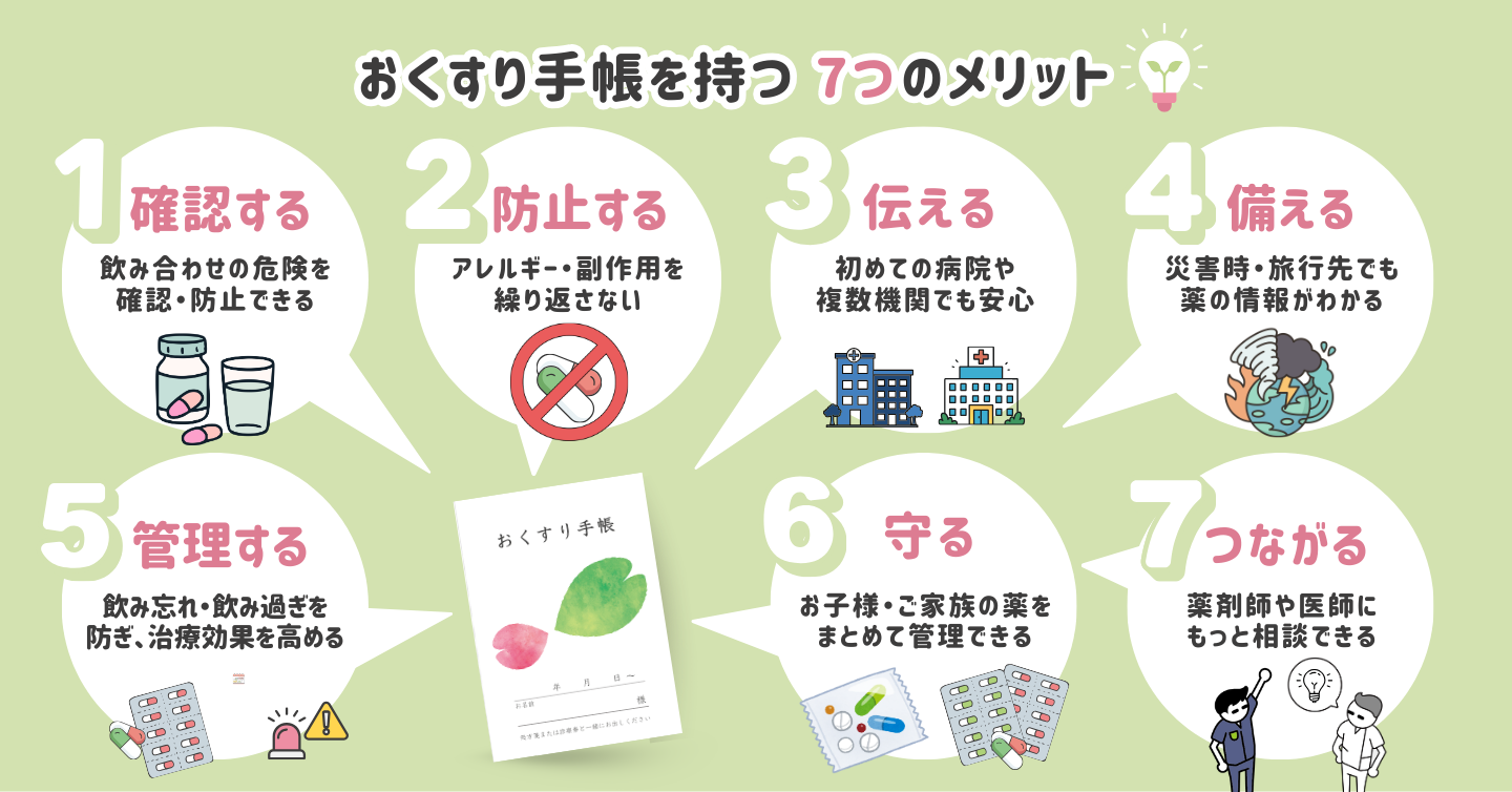 複数の医療機関にかかっている場合でも、おくすり手帳があれば薬剤師がすべての薬の飲み合わせを確認できます。医療機関同士で情報が共有されていない場合でも、手帳があれば安心です。